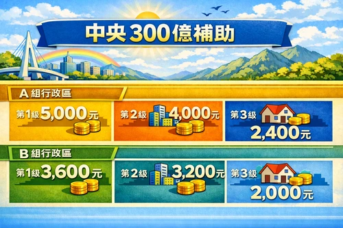 - 中央政府による300億台湾ドルの家賃補助は、賃貸物件の行政区域(A/B)と補助額に応じて月額上限が設定されます。追加補助の対象となる場合は、発表された規則に従って調整されます。