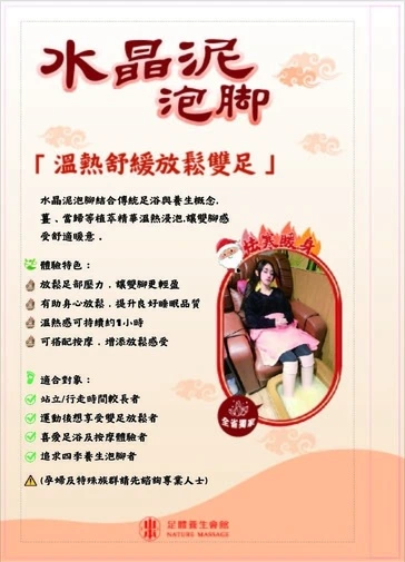 想把放鬆感拉滿,可以把重點放在「 水晶泥泡腳 」。特色在於溫熱感與包覆觸感,作為按摩前置,能讓足部快速「 暖開 」並幫身心進入放鬆狀態;不少人會把它安排在足底或全身按摩前,先暖足、再進入手技流程。適合族群:通勤久站、常穿有跟鞋、或長時間辦公的人,通常感受最明顯。