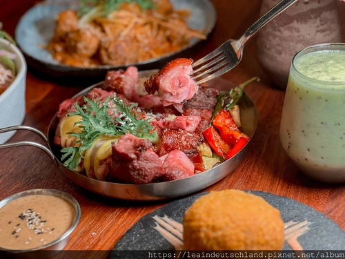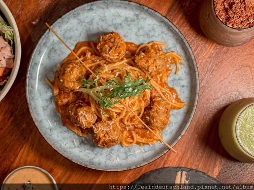 主餐部分肉丸茄汁肉醬義大利麵使用偏粗的麵條,肉醬味道夠、肉丸也紮實;每一口都吃得到肉醬那種滿足感,這道很對路。另一道酥烤德國豬腳走厚實路線,越嚼越香,搭配特製酸菜解膩,適合當作多人一起分食的主角菜。
