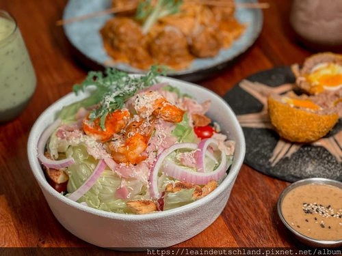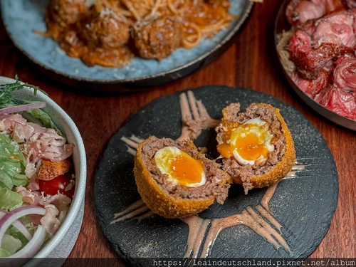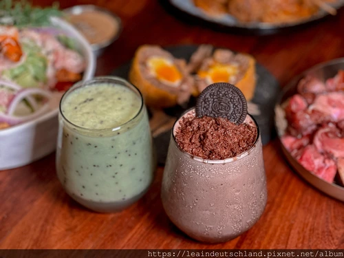 如果是第一次來、又懶得在菜單前面猶豫太久,可以直接點的雙人套餐 1899:組合包含鮮蝦培根沙拉、炸蘇格蘭蛋、老奶奶肉丸茄汁肉醬義大利麵、酥烤德國豬腳佐特製酸菜,再配奇異果蘋果汁、Oreo 巧克力奶昔,甜點則是檸檬千層與榛果巧克力千層。整套吃下來節奏很順:先開胃、再主餐、最後甜點收尾,聚餐不用想太多也不會點失手。