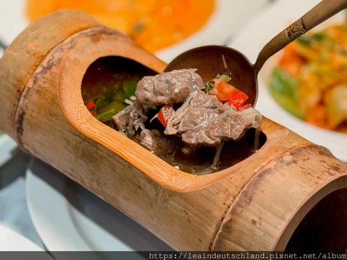 一上桌這個容器就吸引全場目光,也太特別了吧!牛肉燉得軟嫩入味,帶著竹香與香料氣息;湯頭偏酸很開胃,是很特別的滋味。