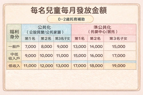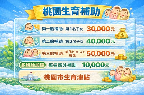 - 桃園市加碼友善托育補助:送托準公共托嬰中心每月加碼 2,000 元,送托準公共居家托育人員每月加碼 1,000 元。