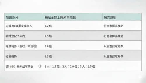 - 若你屬單身青年、新婚育兒或經濟/社會弱勢等身分,可能影響補貼級距或加碼,申請時依系統欄位勾選並上傳佐證。