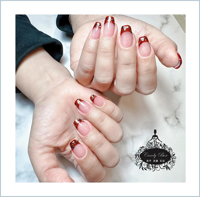 紅色法式比全紅更輕盈;想修飾手指,用窄弧或微 V 線,保守職場可配透明或乳白底、僅在指尖畫細線。節慶把一指加亮片或鏡面點題即可;保養上 3–4 週回店補色,長出時仍清爽。若擔心線條不穩,能以貼紙或線膠輔助,先畫淡淡導線再封層,成功率更高。 指尖線寬控制在甲面寬度的五分之一以內較俐落,越窄越顯精緻。 想換色更省心,可把法式紅限制在指尖三分之一內,長出時視覺乾淨。
