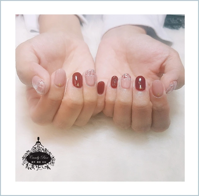 紅棕色把紅的存在感與棕的溫潤結合,穿搭容錯高。秋冬選偏咖紅棕配毛呢與皮革;春夏改偏紅紅棕配棉麻。短甲做霧面俐落,長甲選鏡面或細亮粉罩染更有層次;擔心厚重可改兩指奶茶跳色。若膚色偏黃,可挑略帶玫瑰棕的色票,能壓黃氣、視覺更乾淨。 紅棕與金屬飾片的比例建議少量點綴為主,避免與指寬打架造成厚重感。 喜歡溫柔路線時,紅棕配奶茶與裸粉做拼色,會讓整體更輕盈。