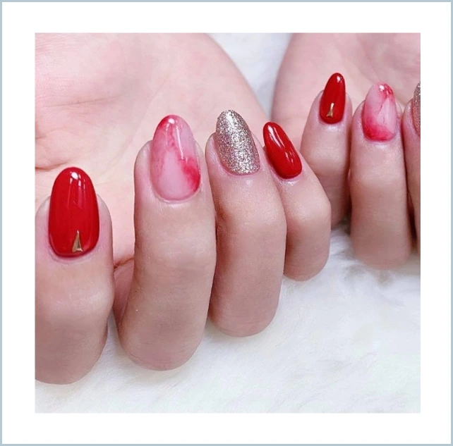 大理石紋以兩至三種紅與白 / 裸粉交疊,再用半透明膠拉絲,紋理才像天然石。想華麗沿紋加金線或金箔;想日常則控制在兩指,其他維持單色或奶油白。中短到中長甲面最能呈現細節,過短易糊、過長難照顧。若想更自然,加入一點玫瑰金薄箔能牽住整體色調。 拉絲時以不規則轉折為主,避免過度對稱;最後用透明膠微蓋紋路增加縱深。 大理石若要更有層次,可先鋪一層半透粉,再交錯紅與白形成雲霧效果。