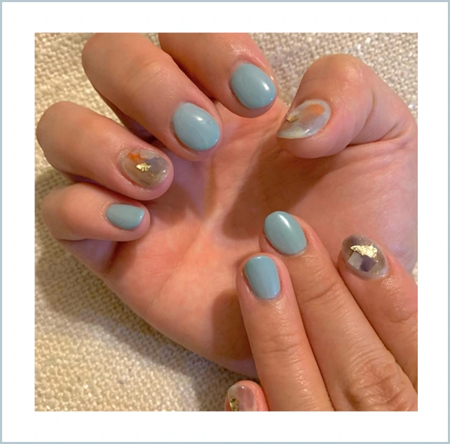 - 指型建議:短甲可做「淺藍純色+1 指金箔透底」俐落清爽;長甲則能加上雲霧暈染或貝殼片,呈現更成熟的層次感。