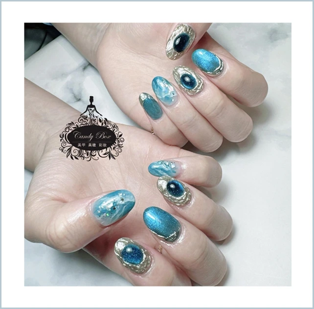 藍色貓眼美甲將深藍、灰藍與磁粉折射融合,呈現如夜空般的光帶效果。這組款式以「深藍貓眼 × 金屬暈邊」為視覺核心,磁粉光帶在指尖形成流動線條,搭配外圈金屬凝膠能加強立體度,尤其在夜晚、燈光或手機手電筒下特別上鏡。若希望降低華麗度,可減少金屬厚度、改為極細金框或透明暈染過渡;想要舞台感更強,則可以提高磁粉濃度或使用寶藍與黑藍漸層。