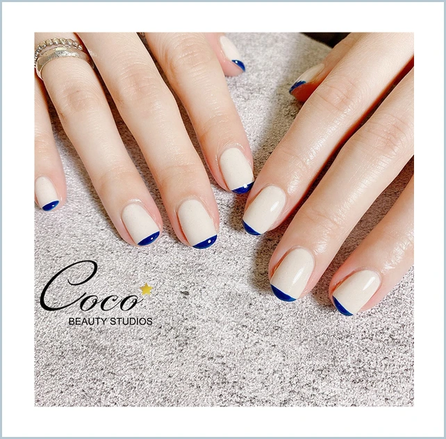 藍色法式美甲|奶油裸底 × 寶藍指尖的俐落微笑線組合