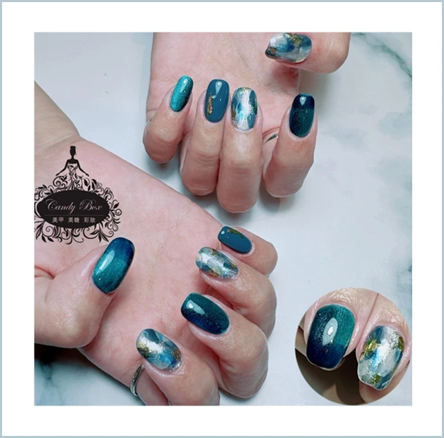 - 質地選擇:想低調可搭配霧面藍混合純色指;想夜晚上鏡可採高亮光面+高密度磁粉。